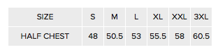 | Half Chest (cm) | 48 | 50.5 | 53 | 55.5 | 58 | 60.5 |